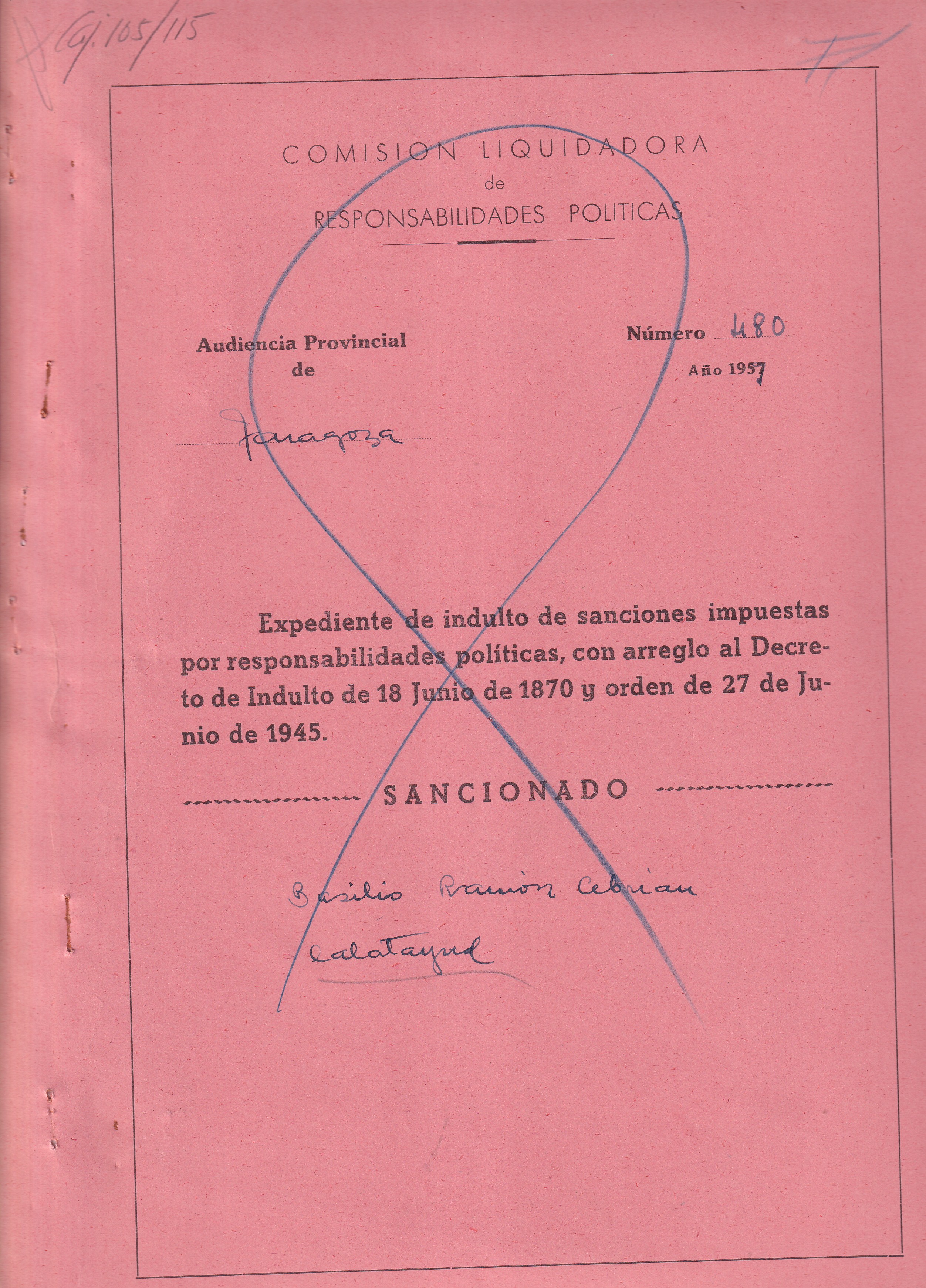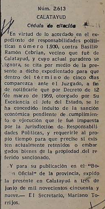 - Tribunal Nacional de Responsabilidades Políticas (Centro Documental de la Memoria Histórica). Signatura: 75/00105 | Calatayud (Zaragoza) | Indulto (1959).