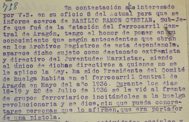 […] sobre la actuación de BASILIO RAMON CEBRIAN, no existen datos concretos acerca de la misma así como de las personas que puedan atestiguarlo, algunas de las cuales, por ser significados extremistas, se les aplico la ley.