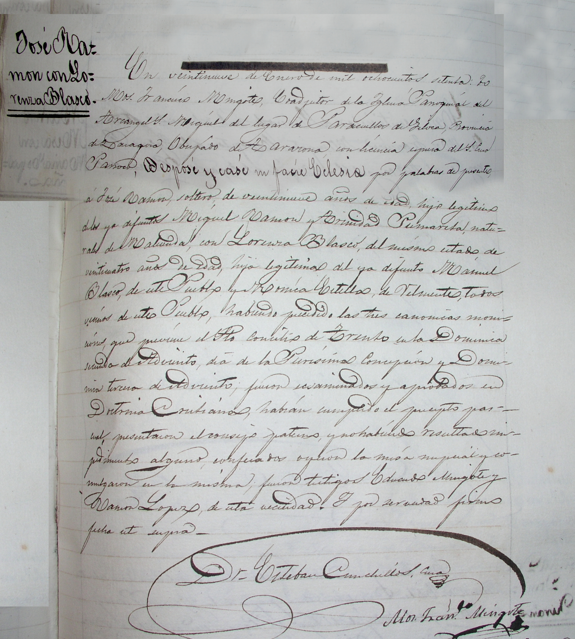 En veintinueve de Enero de mil ochocientos setenta: yo Mosen Francisco Mingote, coadjutor de la Iglesia Parroquial del Arcángel San Miguel del lugar de Paracuellos de Jiloca, Provincia de Zaragoza, Obispado de Tarazona, con licencia expresa del Señor cura Párroco, Desposé y casé in facie Eclesia por palabras de presentes a José Ramón, soltero de veintinueve años de edad hijo legítimo de los ya difuntos Miguel Ramón y Trinidad Pumareta, naturales de Maluenda, con Lorenza Blasco, del mismo estado de veinticuatro años de edad, hija legítima del ya difunto Miguel Blasco de este Pueblo y de Mónica Estella de Belmonte, todos vecinos de este pueblo, habiendo ### las tres canónicas moniciones que presume el Santo Concilio de Trento en la Dominica semana de Adviento, día de la Purísima Concepción y Domenica tercer de Adviento…