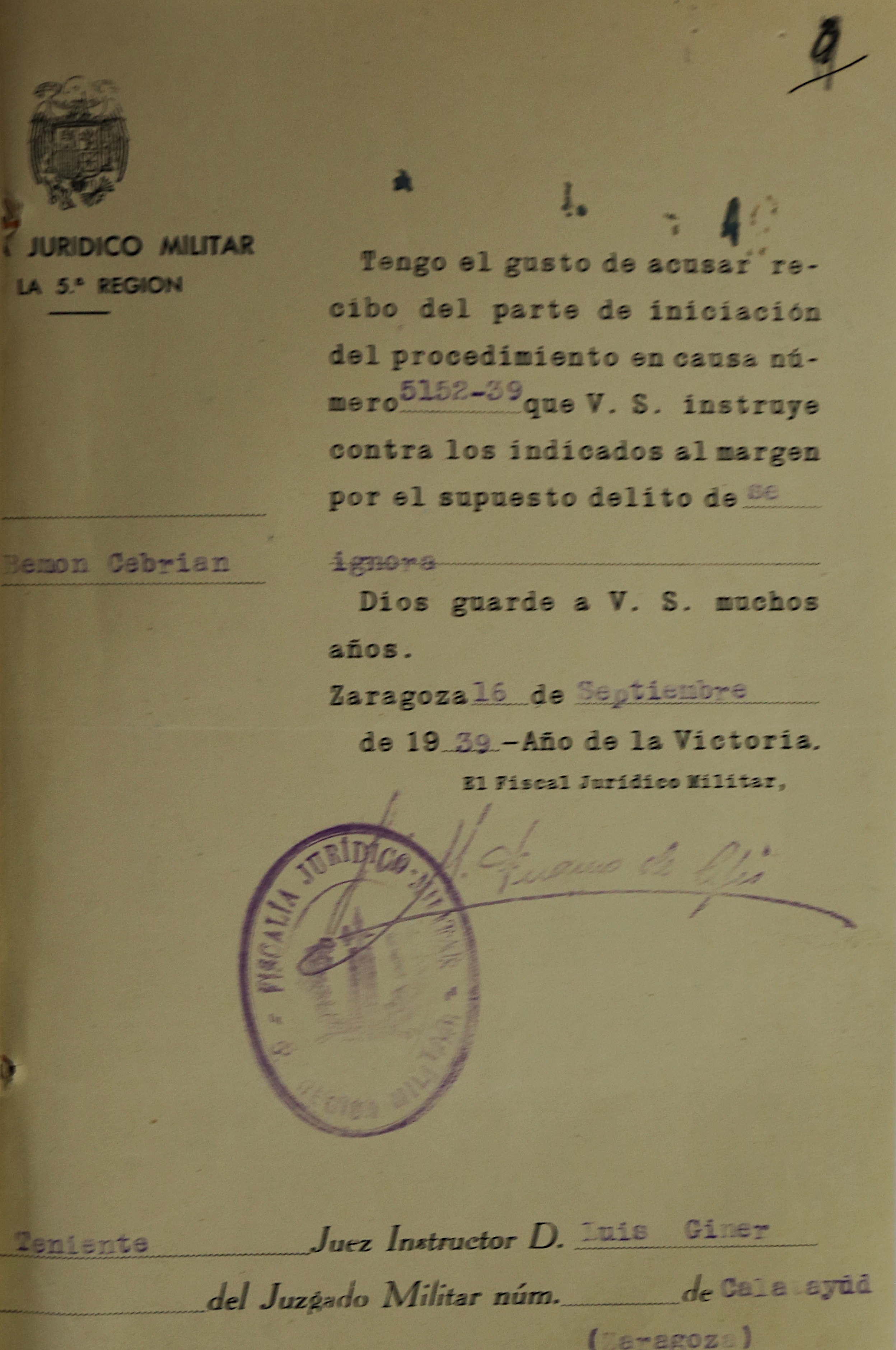 - Auditoría de Guerra de la 5 Región Militar : Consejo de Guerra Ordinario de Plaza. Número de procedimiento: 1645-38.
