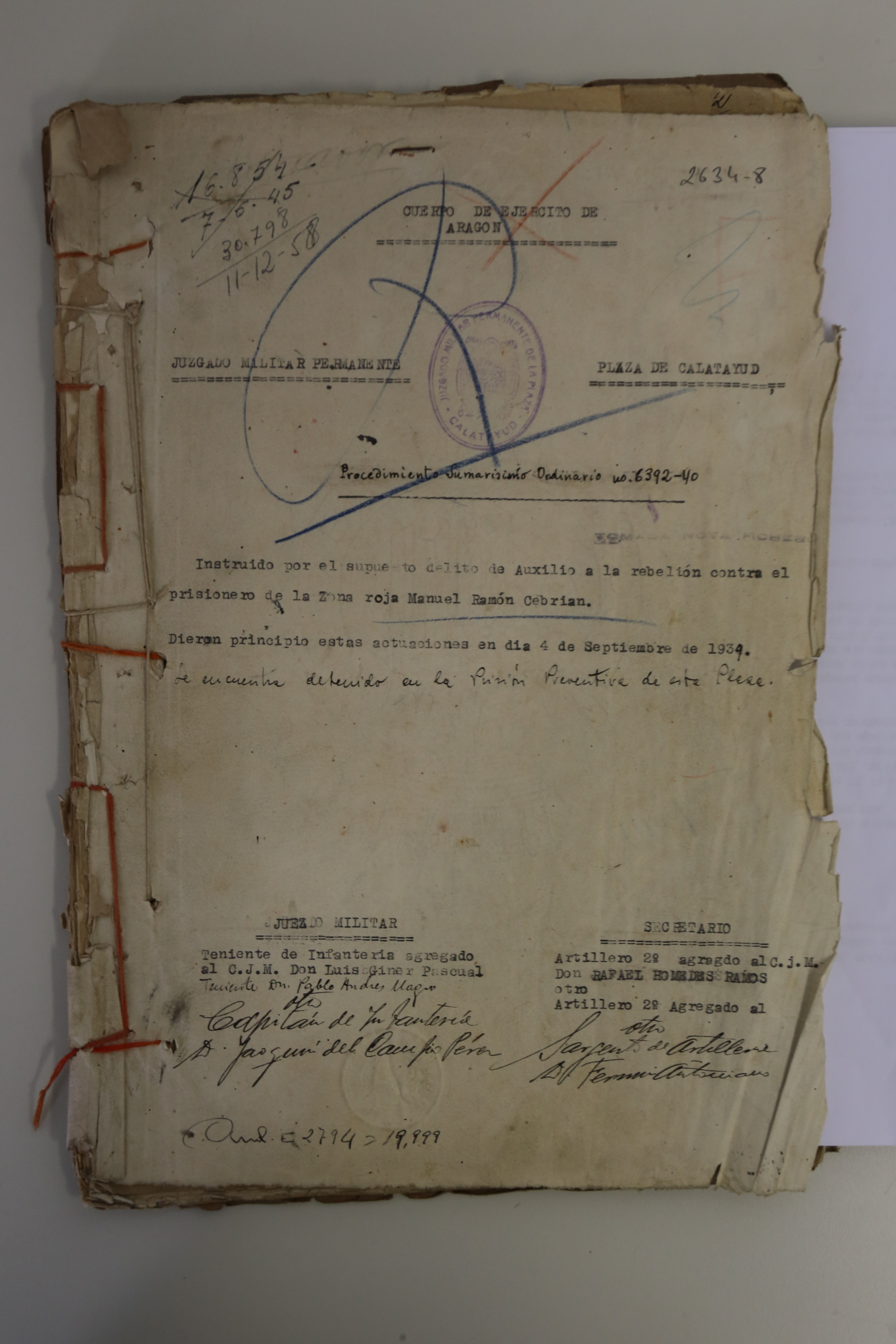El 7 de Diciembre de 1938 se inicia el Consejo de Guerra. El acusado sería trasladado a las 10:30 del 14 de Febrero de 1939 a la Sala de lo contencioso de la Audiencia Territorial de Zaragoza para la celebración del Consejo de Guerra.