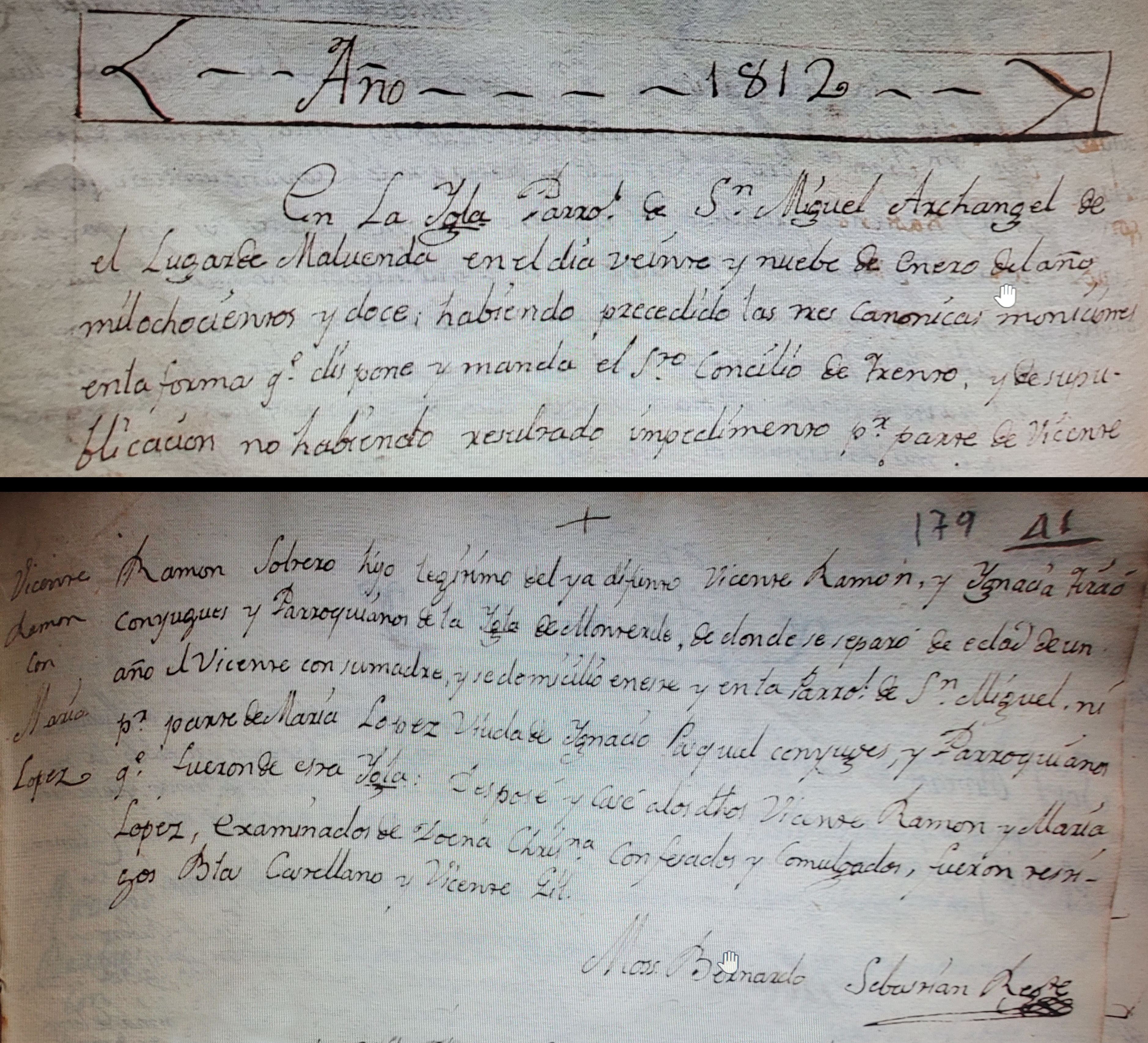 En la Iglesia Parroquial de San Miguel Archangel de lugar de Maluenda en el día veinte y nuebe de Enero del año mil ochocientos y doce, habiendo precedido las tres canónicas moniciones en la forma que dispone y manda el Santo Concilio de Trento y de su publicación no habiendo resultado impedimento por parte de Vicente Ramón soltero hijo legítimo del ya difunto Vicente Ramón y Ignacia Tizao conyuges y Parroquianos de la Iglesia de Monterde, de donde se separó de edad de un año el Vicente con su madre y se domicilió en este y en la Parroquia de San Miguel ni por parte de María López Viuda de Ignacio Pasqual conyuges y Parroquianos que fueron de esa Iglesia: Desposé y casé a los dichos Vicente Ramón y María López, examinados de Doctrina Christiana. Confesados y comulgados, fueron testigos Bla Castellano y Vicente Gil.