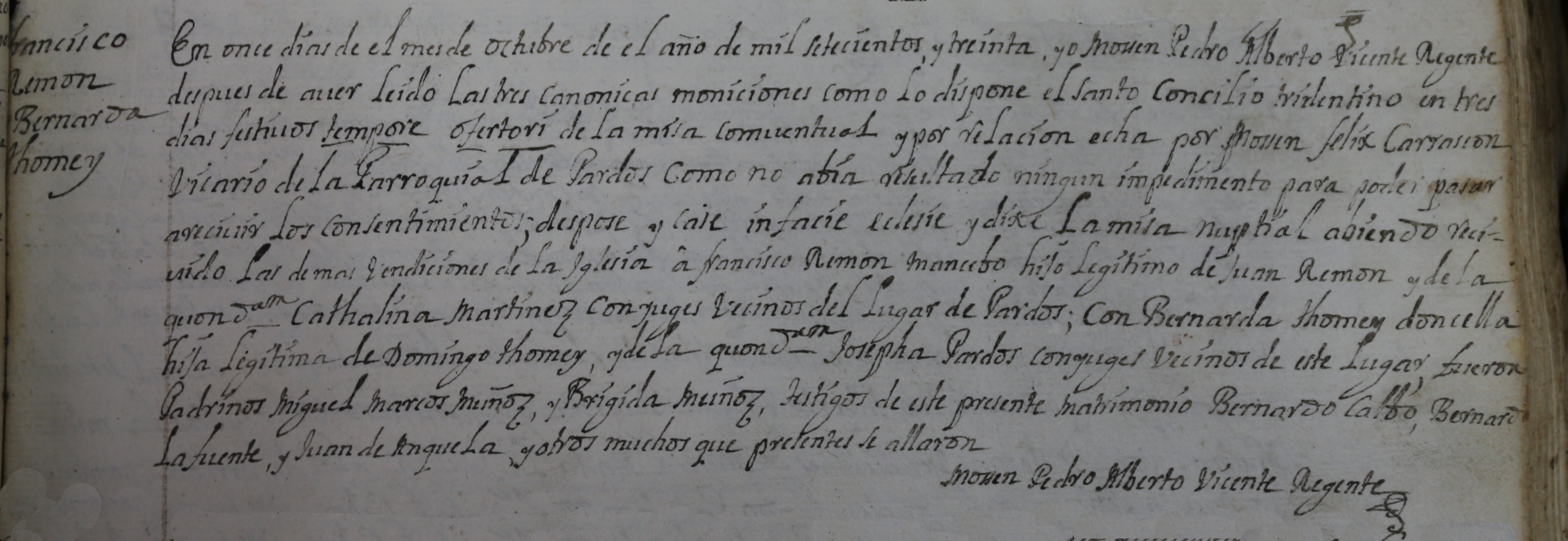 En once dias de el mes de octubre de el año de mil setecientos y treinta, yo mosen Pedro Alberto Vicente Regente despues de aver leido las tres canonicas moniciones como lo dispone el Santo Concilio tridentino en tres días festivos tempore ofertori de la misa comventual y por relacion echa por mosen Felix Carrascon Vicario de la Parroquial de Pardos como no abia resultado ningun impedimento para poder pasar a recivir los consentimientos; despose y case infacie eclesie y dixe La misa nuptial abiendo recivido Las demas bendiciones de La Iglesia a Francisco Ramón mancebo hijo legitimo de Juan Ramon y de la quon Iam Cathalina Martinez conyuges vecinos del lugar de Pardos; con Bernarda Thomey doncella hija legitima de Domingo Thomey y de la quon Iam Josepha Pardos conyuges vecinos de este Lugar fueron Padrinos Miguel Marcos Muños y Brigida Muñoz, testigos de este presente matrimonio Bernardo Calbo, Bernardo Lafuente y Juan de Anguela y otros muchos que presentes se allaron.
