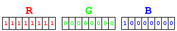 Ya hemos visto antes que cada color se codifica con 8 bits (256 valores). Por ejemplo, un pixel de una fotografía almacenaría estos valores: