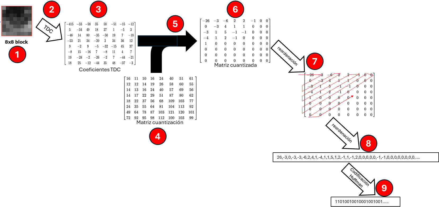 ⑦ El siguiente paso es reordenar la matriz para convertirla en una tupla (pasamos de una matriz de [8,8] a una tupla de [1,64] ⑧. Pero el orden de selección es muy particular (lo he dibujado en el gráfico). El motivo de esa selección en zigzag es que todos los ceros provenientes de las altas frecuencias aparezcan seguidos al final de la tupla unidimensional.