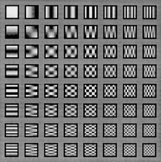 En la imagen siguiente se representan las funciones coseno que, convenientemente moduladas por coeficientes, permiten obtener cualquier imagen compuesta de un cuadrado de 8 * 8 píxeles.