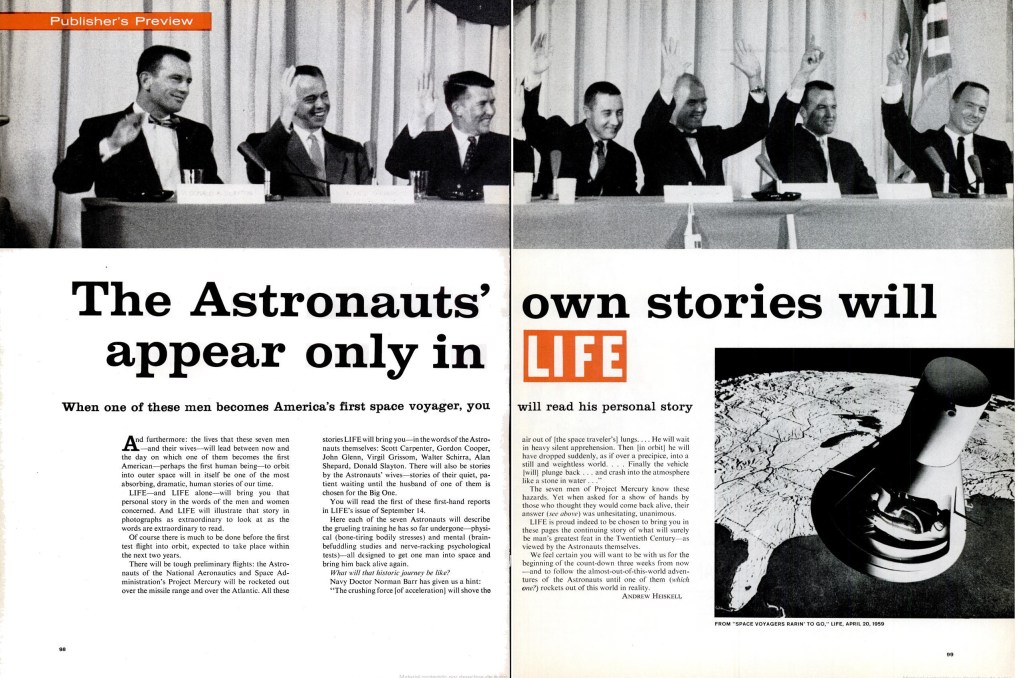 La génesis del contrato de la revista LIFE con los astronautas del Proyecto Mercury varía según las fuentes utilizadas en la investigación. Todos los astronautas hicieron mención de ese hecho en sus autobiografías publicadas (o biografías autorizadas, ya que, al igual que los artículos que aparecieron en la revista, siempre había una mano o escritor dispuesto a cantar la gloria del héroe).