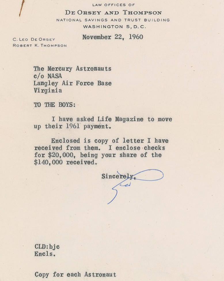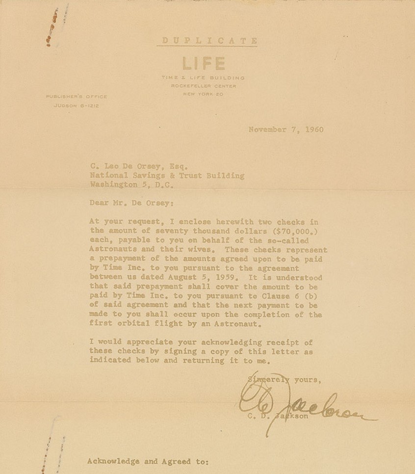 El primer pago de LIFE se realizó el 7 de noviembre de 1960, como puede verse en la carta enviada por C.D. Jackson de LIFE a Leo DeOrsay, representante de los astronautas. Como puede leerse, el segundo pago se retrasaría hasta que el primer norteamericano orbitara la Tierra. También hay una copia de la carta que Leo mandó a cada uno de los astronautas.