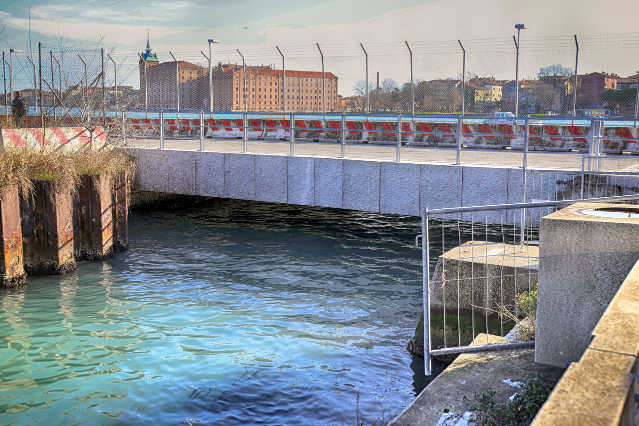 Damos media vuelta y emprendemos el regreso hacia el parking de San Basilio. Antes de alcanzar el Terminal de Cruceros, nos desviamos hacia la Salita San Basegio y giramos a la izquierda por la Calle Bevilacqua, que se prolonga en la Calle Lardoni: un apacible sendero de tierra, flanqueado por franjas de césped y un muro de ladrillo rojo. En la última curva a la izquierda se abre ante nosotros la Fondamenta de la Pescharia, de la que emerge, inevitable, el Ponte del Piovan.