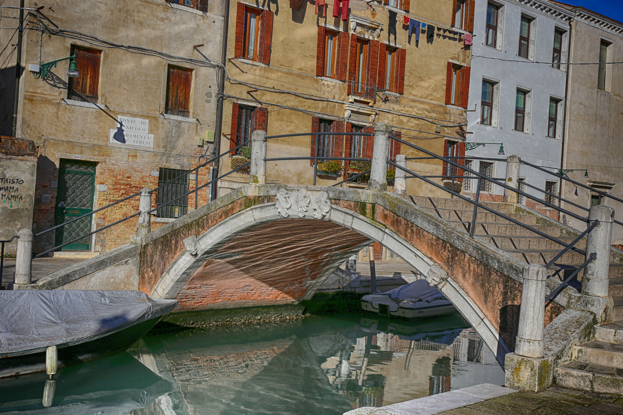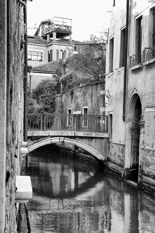 Para fotografiar este puente tuve que buscar en las proximidades una calle morta, vía que concluye de manera abrupta en el agua, como si de trampolines se trataran. Y sí, había una: el Ramo Secondo della Toletta.