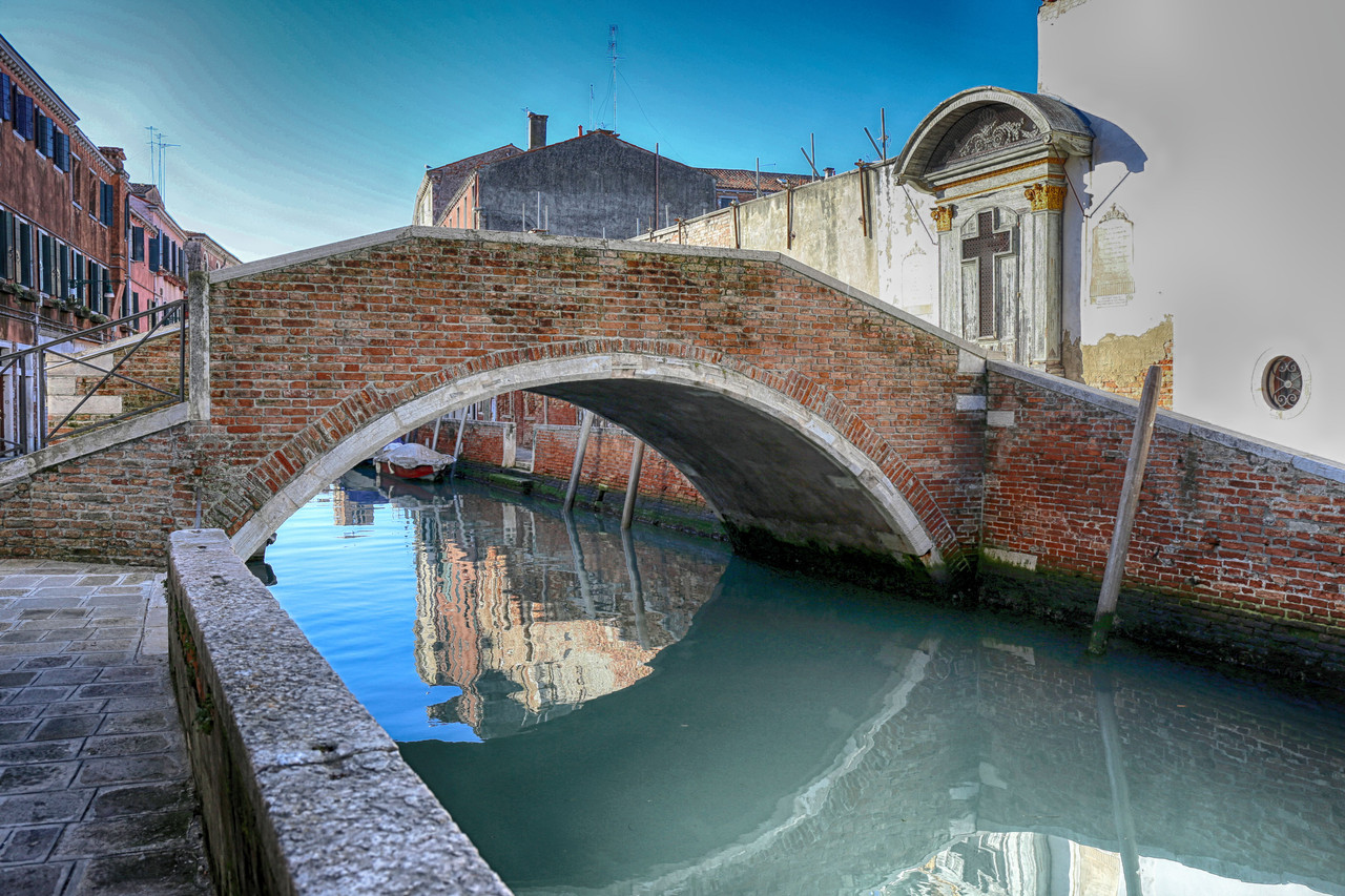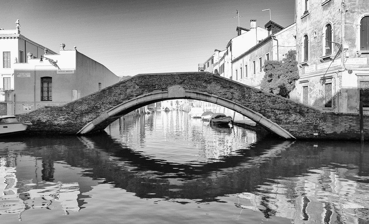 Tras cruzar a la otra orilla para fotografiarlo, continuamos por la Fondamenta del Soccorso hasta situarnos en la base de la T que dibujan el Río del Carmini y el Río dei Tre Ponti, buscando el punto exacto desde el que el arco del Ponte Briati y su reflejo se funden en un solo ojo, inmortalizado ya en este blog.