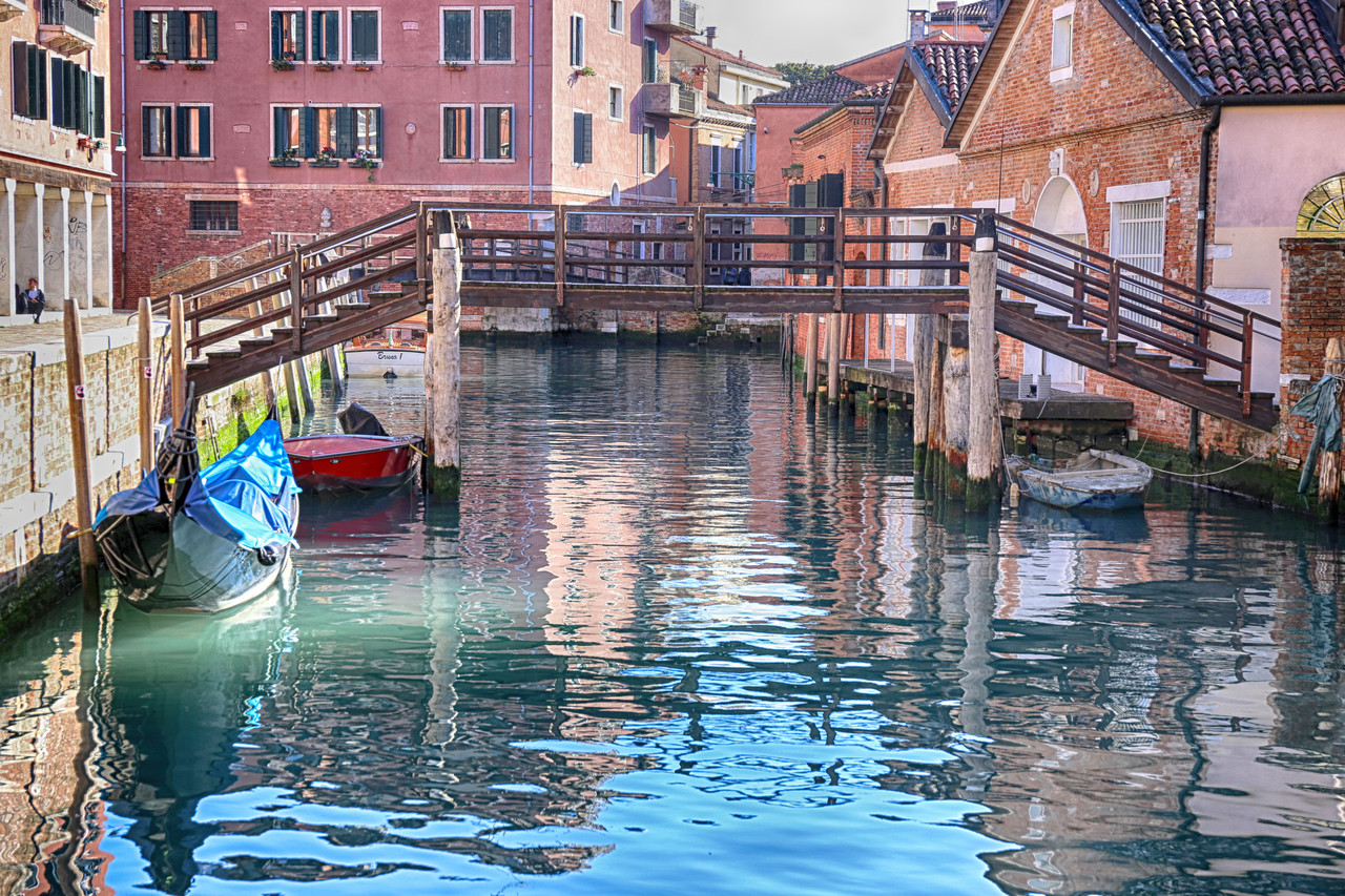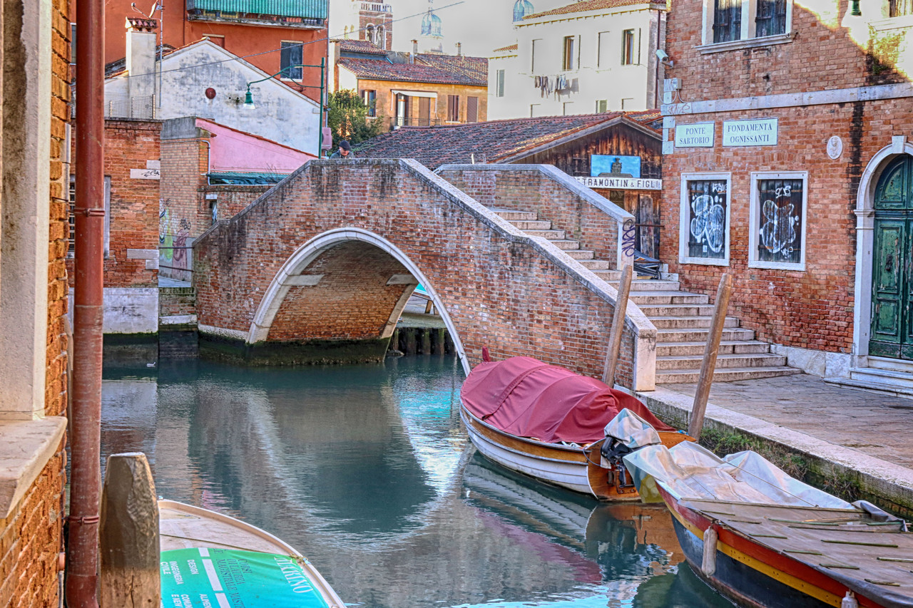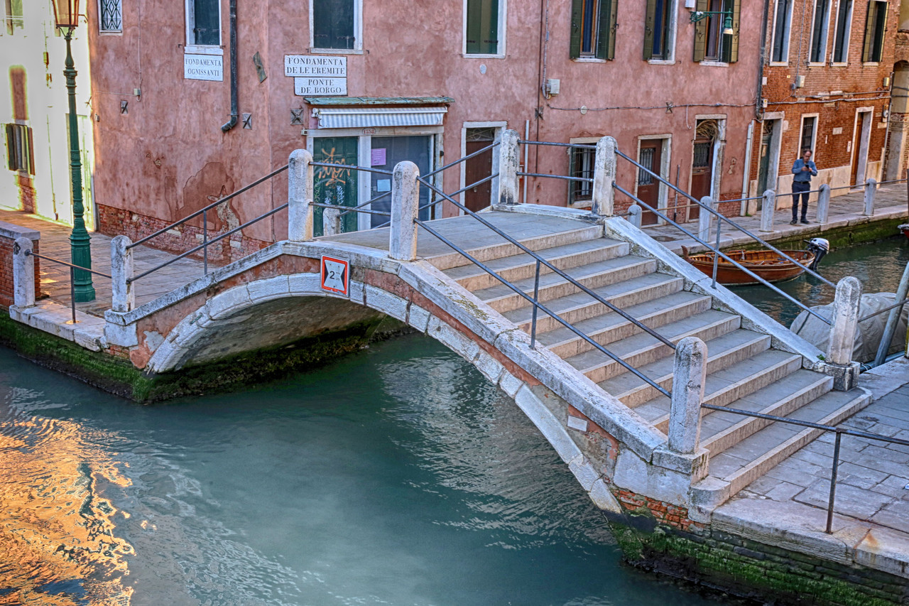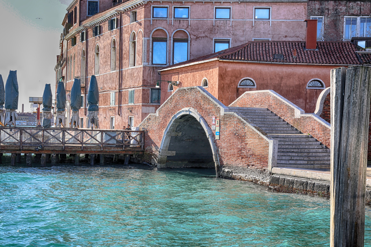 Por el Rio Terà dei Catecumeni giramos a la izquierda hacia la Calle dei Squero, hasta desembocar en la Fondamenta Zattere. Para fotografiar el Ponte de l’Umiltà, crucé el puente y me adentré por uno de los estrechos pasillos de madera que se internan en la laguna —¡quién dijo miedo!—, donde atracan barcas y góndolas. Es casi la única forma de capturar imágenes de los puentes desde la Fondamenta Zattere, o, con un buen teleobjetivo, desde la isla de la Giudecca. En algunos casos también puede intentarse desde los canales que desembocan en el Canal de la Giudecca.