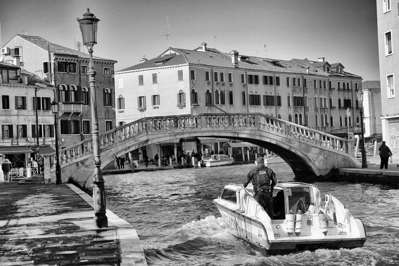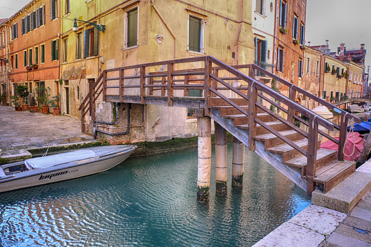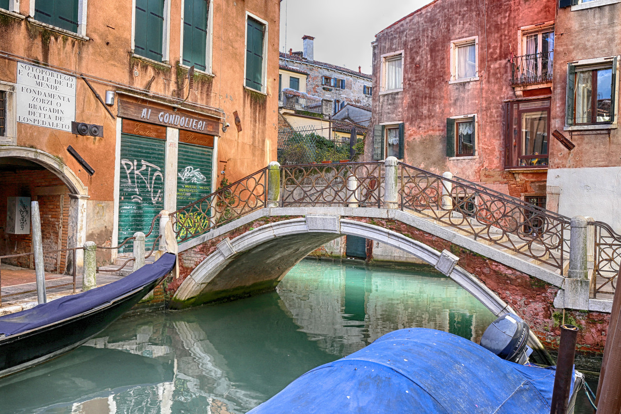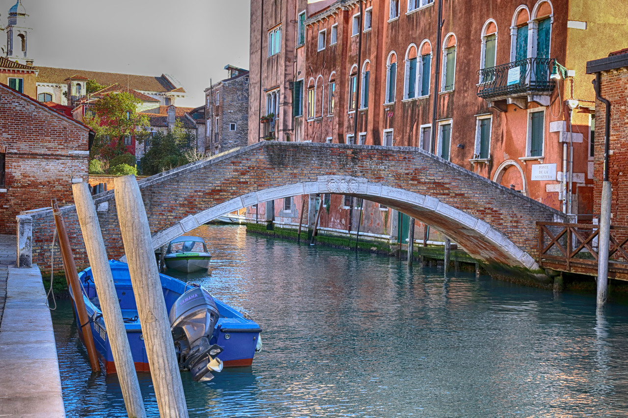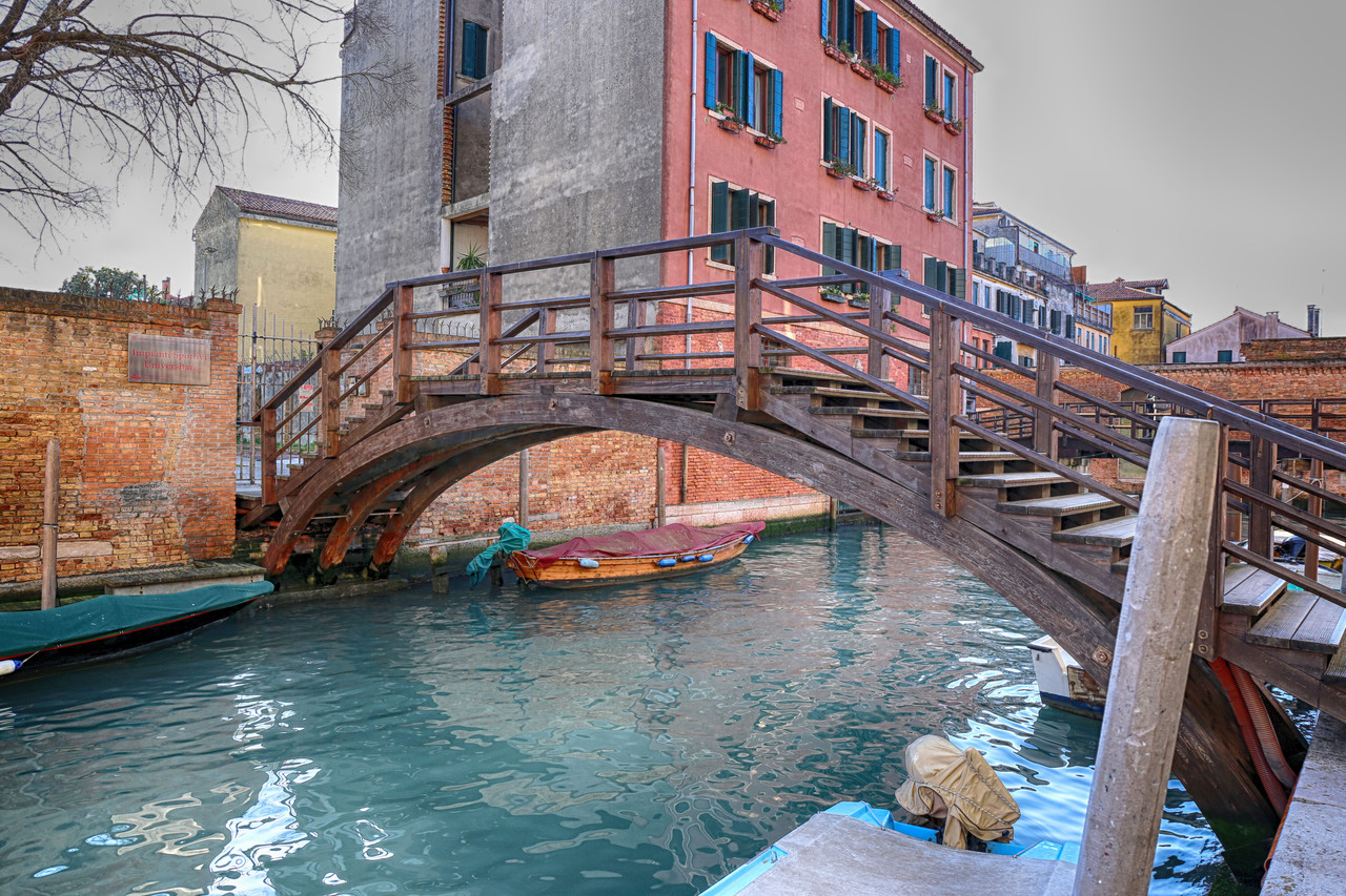 Por el Rio Terà dei Catecumeni giramos a la izquierda hacia la Calle dei Squero, hasta desembocar en la Fondamenta Zattere. Para fotografiar el Ponte de l’Umiltà, crucé el puente y me adentré por uno de los estrechos pasillos de madera que se internan en la laguna —¡quién dijo miedo!—, donde atracan barcas y góndolas. Es casi la única forma de capturar imágenes de los puentes desde la Fondamenta Zattere, o, con un buen teleobjetivo, desde la isla de la Giudecca. En algunos casos también puede intentarse desde los canales que desembocan en el Canal de la Giudecca.