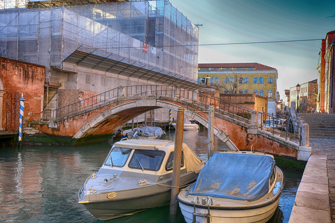 Al llegar a la Calle del Vento, giramos a la derecha —porque a la izquierda, salvo que tengas ganas de un chapuzón inesperado, resulta francamente complicado—. El viento, o el nombre de la calle, nos acompaña como un guía invisible, arrastrándonos hasta el Campo de San Basegio, que da acceso a la fondamenta donde se alza el Ponte San Basegio, impertérrito ante el andamiaje que intenta darle nueva vida.