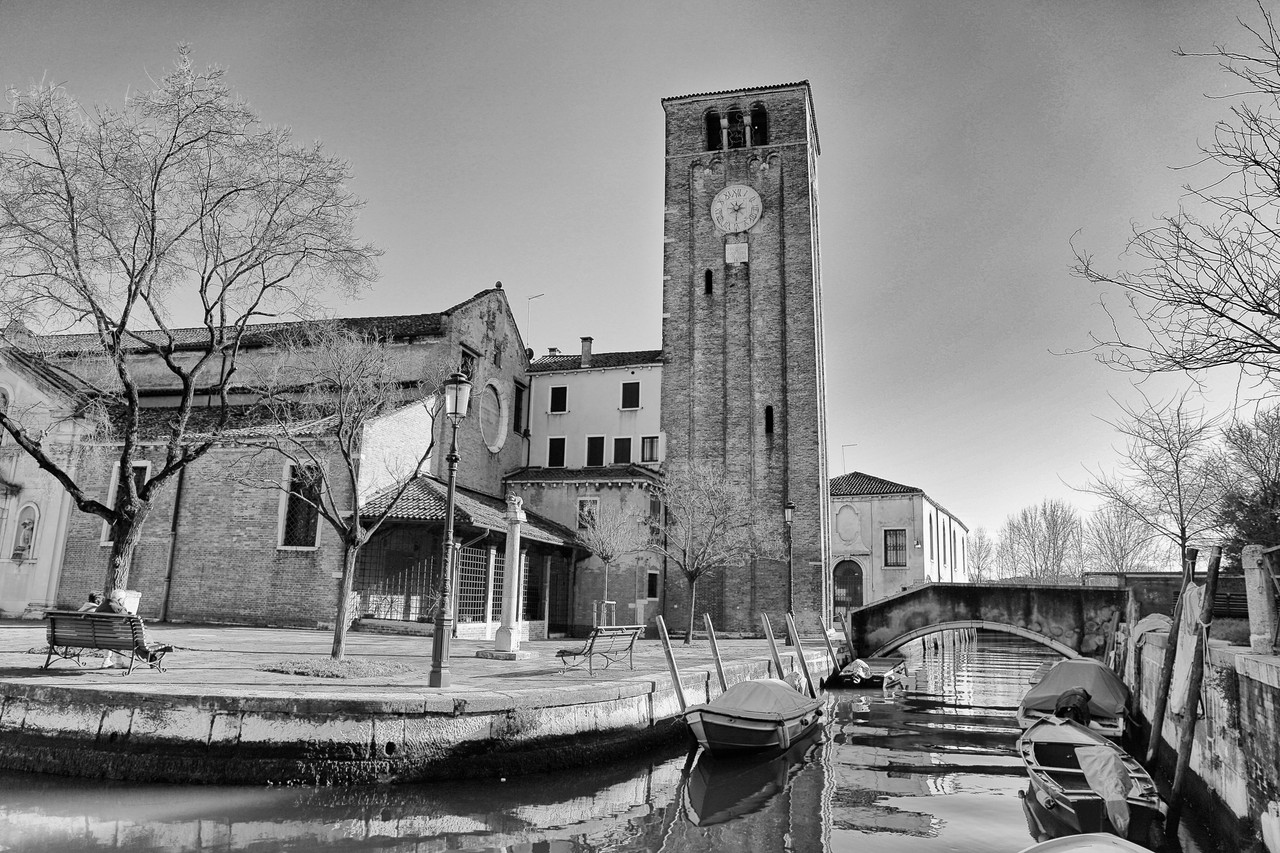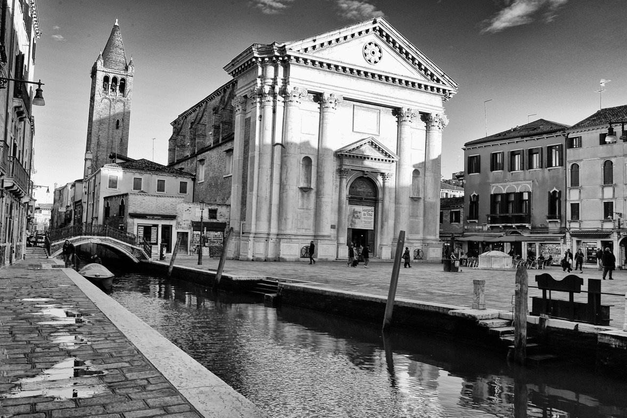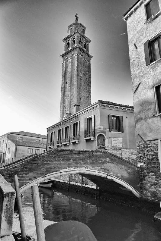 Si te desplazas unos pasos hacia la derecha por la Fondamenta Gherardini, la composición se revela casi por sí sola, como un encuadre esperado. La mía, en cambio, fue ligeramente forzada: el magnífico campanario se alzaba en contraluz, recortado contra el cielo, obligándome a invocar al dios Apolo para rescatar su imagen del tártaro oscuro que apareció en la captura.