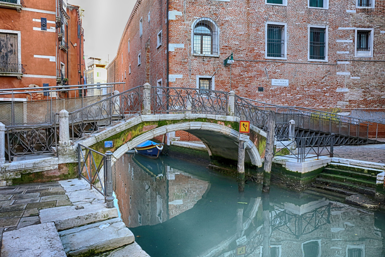 Durante nuestro avance por Rio Terà Ognissanti, es posible adivinar el antiguo cauce del canal que aquí fluía, como un recuerdo líquido todavía susurrando bajo la piedra y el adoquín. Fíjate cómo el centro de la calle se distingue de los laterales, como un lápida que encierra el espíritu del viejo canal. En 1866, este rielo fue condenado a convertirse en tierra firme. No existe castigo más cruel para un canal veneciano: arrancarle el devenir de sus aguas es arrebatarle el alma misma.