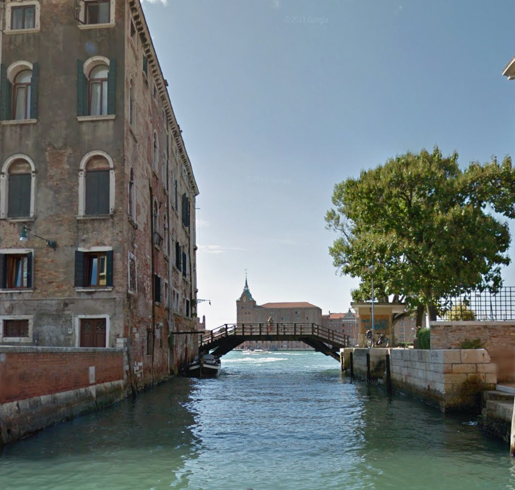 Avanzamos por la orilla del Rio de l’Anzolo Rafael hasta quela Fondamenta quiebra su curso en un ángulo recto y se convierte en el Campiello de l’Oratorio. Rodeamos la imponente torre cuadrada de la iglesia de San Nicolo Mendicoli y, justo a sus pies, aparece el Ponte privato de la IUAV (Instituto Universitario de Arquitectura de Venecia).