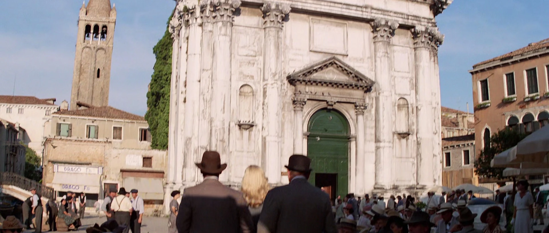 Segunda pista: tres arqueólogos —uno de ellos rubia y nazi— siguen las claves anotadas en el diario del padre de uno de ellos. Excavan bajo la iglesia, atraviesan catacumbas, pistean ratas, profanan la tumba de un guerrero templario y se sumergen en aguas oscuras bajo el fuego de un lámina de petróleo. Finalmente, emergen por una alcantarilla en el centro de la plaza. Creo que con eso basta para que adivines a qué película me refiero.